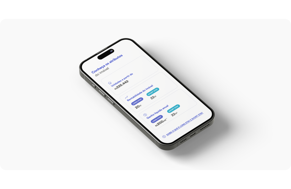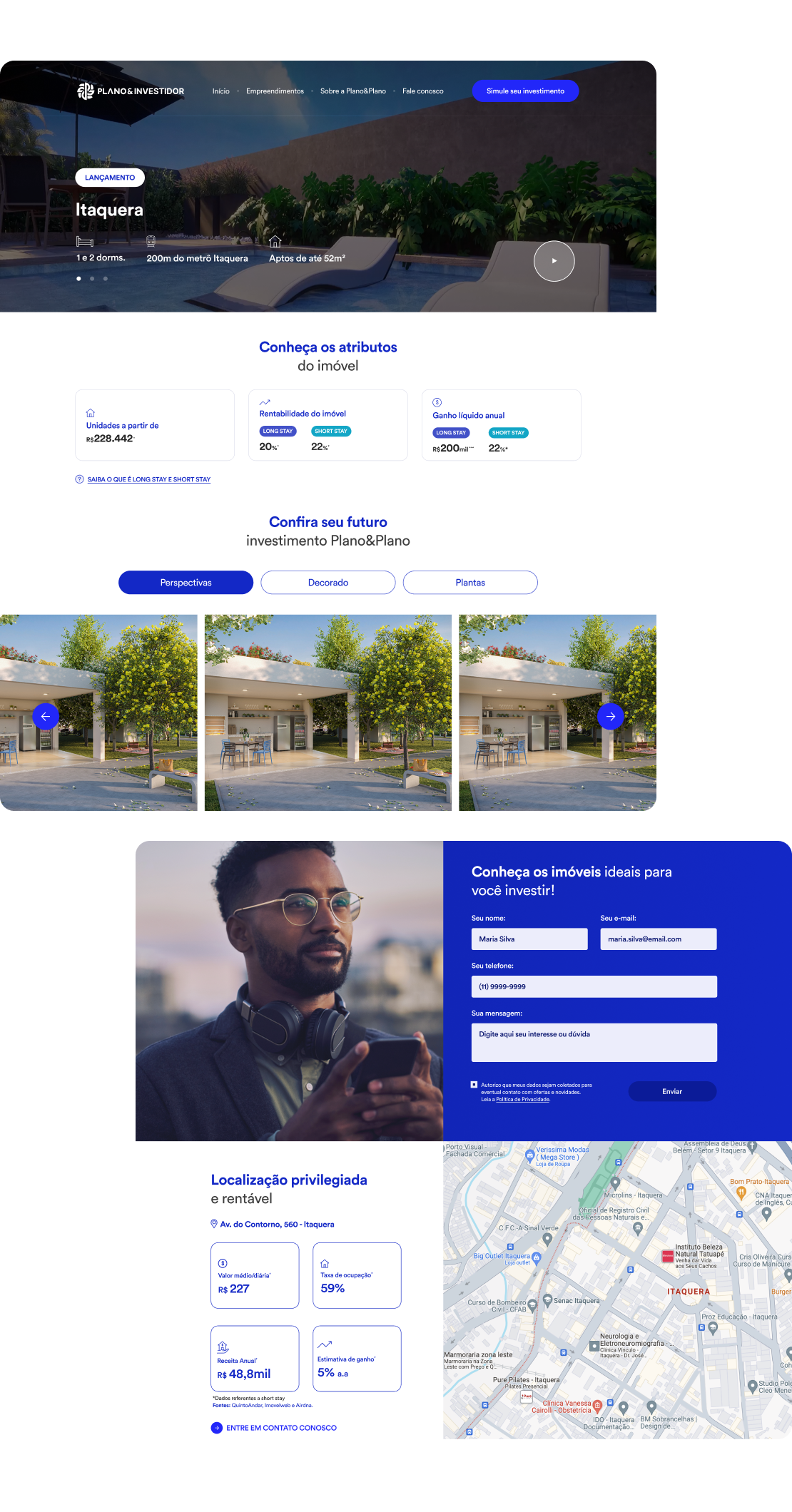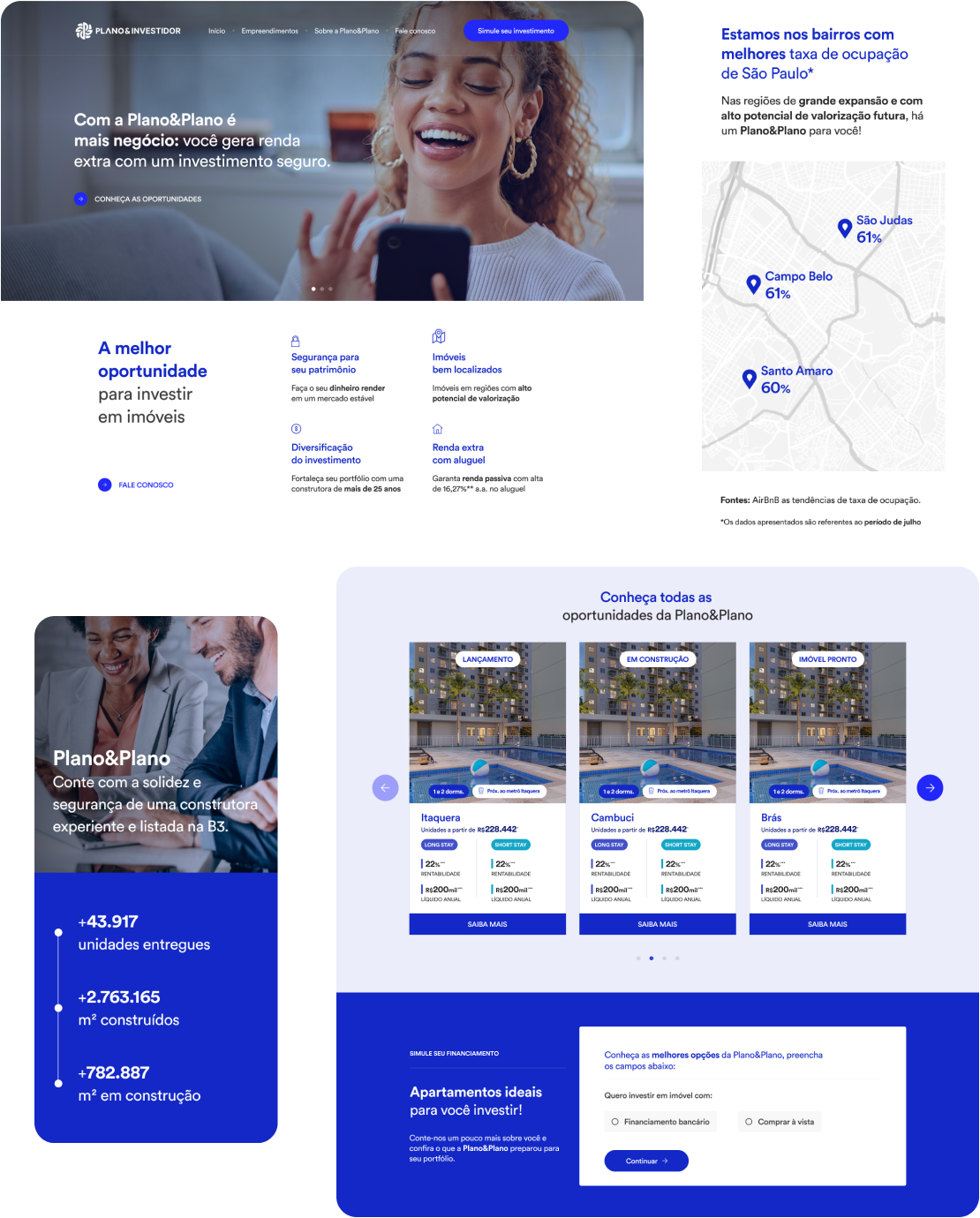 Solução: primeiro, trabalhamos com uma variação do azul da marca na paleta de cor para que o usuário entendesse a mudança de ambiente. Então, começamos a narrativa já no banner principal, apresentando as personas e vantagens. Em seguida, destrinchamos os motivos de porquê escolher os imóveis da Plano&Plano para investimento. Seguimos com a apresentação dos imóveis, e aqui um ponto chave foi quanto as informações exibidas e como deixar elas resumidas, visualmente equilibradas e legíveis. Todas as informações são referentes a rentabilidade e vantagens de cada imóvel. Oferecemos ainda um simulador de investimento, informações sobre as melhores taxas de ocupação em São Paulo/SP e um reforço do posicionamento e credibilidade do cliente quanto ao mercado.
